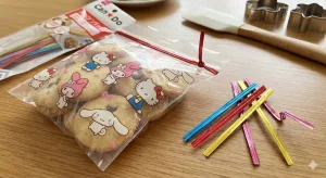 キャンドゥのサンリオコラボや動物柄のジップバッグを活用。中身を入れた後、口の部分に「メッセージタグ」を通してから付属のタイで留めるだけ。推しのメンバーカラーのタイを選べば、推し活バレンタインにも最適!