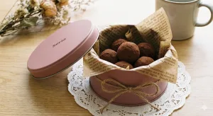 セリアで人気の「くすみカラー缶」を使用。中に英字プリントのワックスペーパーを敷き、トリュフを詰めます。蓋を閉める前にレースペーパーを1枚挟み、麻紐で縛れば、100円とは思えないアンティーク風ギフトの完成です。